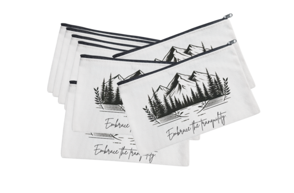 Embrace the Tranquility” Pouch: This elegant and functional pouch, sized at 8.3 x 5 inches, features a serene black and white illustration of a mountain and forest landscape.